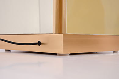 制作工藝:采用9厘UV板為基材,面貼5厘鏡面玻璃,開模制作鋁合金型材對角拼接,10厘超清超白鋼化玻璃臺面,鋁合金型材抗氧化處理,拉絲效果、電泳防指紋技術